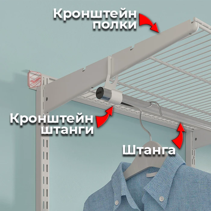 В комплект входят все необходимые элементы для монтажа, включая рельс, стойки, полки, штангу и кронштейны. Система выполнена в элегантном графитовом цвете (RAL 7016), который органично впишется в современный интерьер.