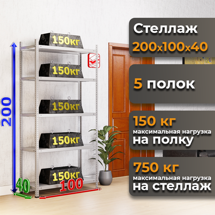 Стеллаж архивный высотой 200 см, шириной 100 см, глубиной 40 см, с пятью полками и максимальной нагрузкой до 150 кг, купить в Москве ;