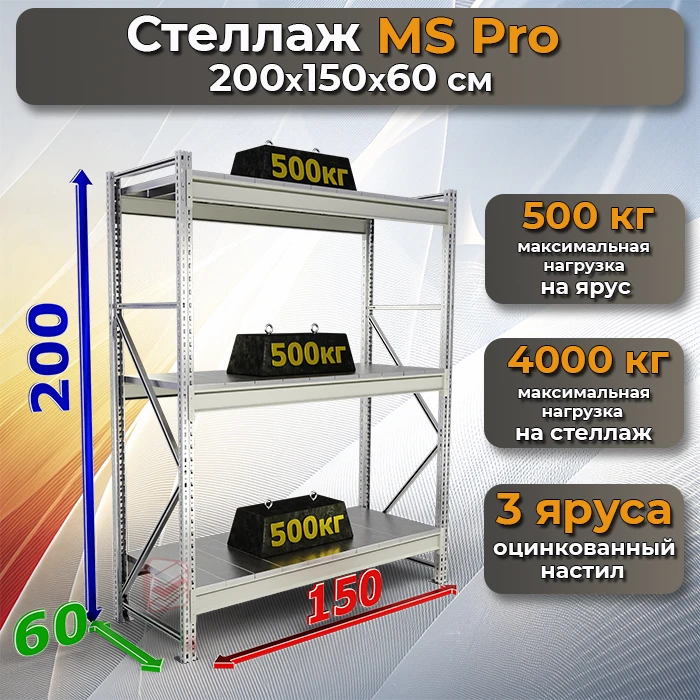 Стеллаж складской MS Pro 200х150х60 с 3 полками — оптимальное решение для хранения грузов на складах, производствах, в гаражах, торговых точках и кладовых.