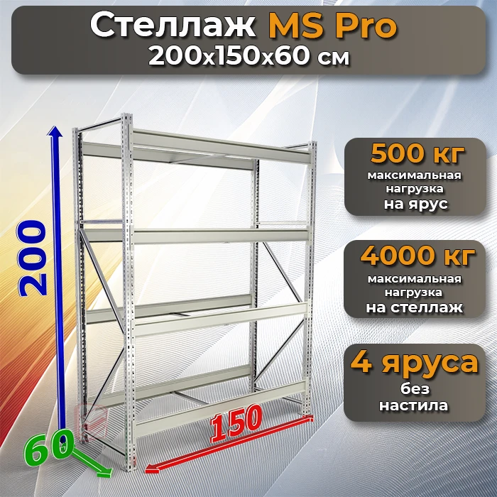 Каркас стеллажа 4 яруса MS Pro 200х150х60 складской
