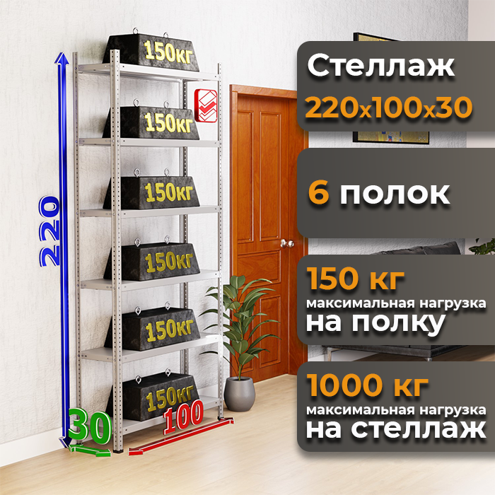 Стеллаж высотой 220 см, шириной 100 см, глубиной 30 см, с шестью полками с максимальной нагрузкой до 150 кг.